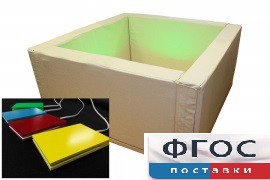 Каркас сухого бассейна изготовлен из высококачественной фанеры толщиной 9мм, обшитой поролоном. Материал стенок: ПВХ. В стенки бассейна вмонтированы колонки музыкального центра. При звучании музыки стенки бассейна создают легкую вибрацию, которую можно ощутить, находясь в бассейне. Для выбора цвета подсветки сухого бассейна используются клавиши-переключатели черырех цветов, которые на проводах могут быть как вынесены на стенки бассейна, так и установлены за его пределами на полу. В состав также входит система подсветки, которая содержит электронное устройство управления, позволяющее автоматически переключать цвета подсветки без клавиш.