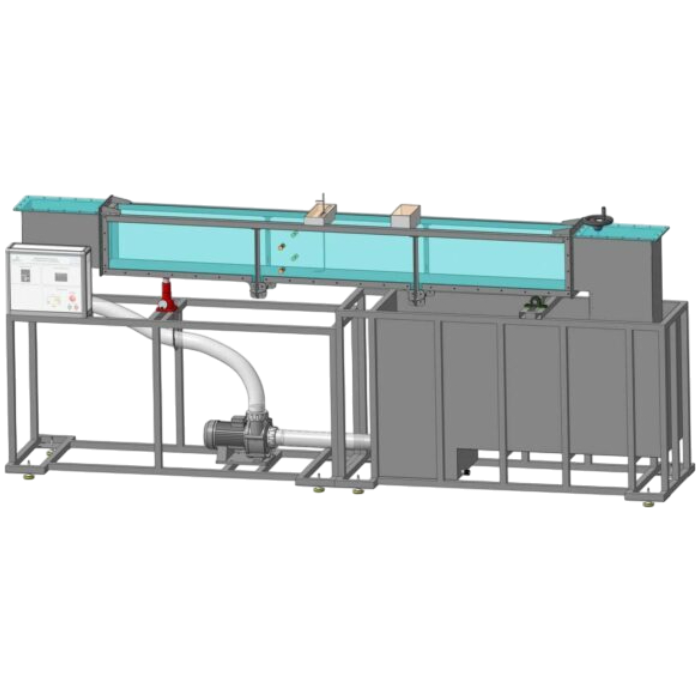 Проточная часть является основным элементам для проведения лабораторных работ. Проток представляет собой, сварную конструкцию из стали, с прозрачными вставками из акрилового материала, с механизмом качения и опорой для домкрата, также в конструкции имеются фланцы для присоединения напорного и сточного баков. В боковых частях протока, имеется механизм фиксации предназначенный для установки различных видов водосливов, разделителей и порогов. На выходе проточной части установлена механическая задвижка, изменение положения производятся при помощи рукоятки. Изменение угла наклона проточной части производится с помощью подъемного механизма. Измерение скорости потока осуществляется трубкой Пито.